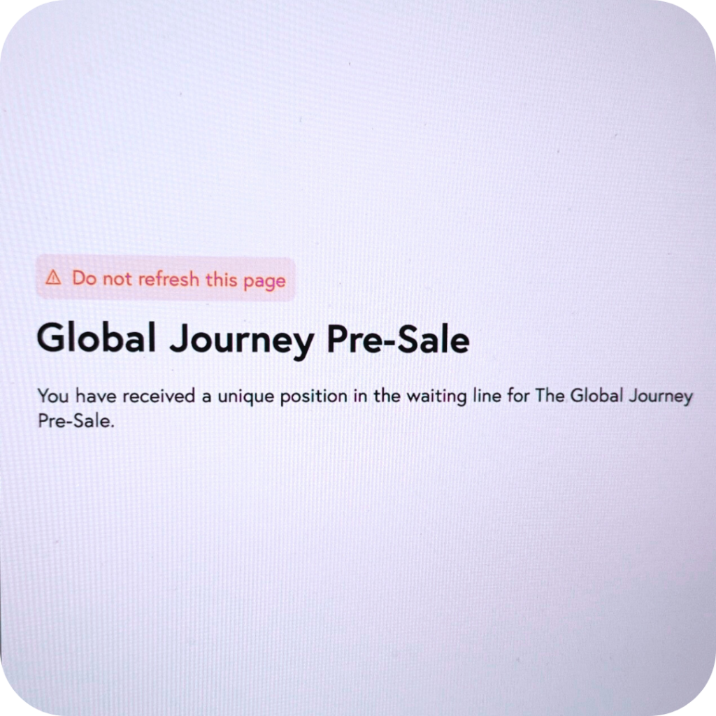 If you decide not to do Global Journey and instead try the Worldwide Pre-Sale and Worldwide Ticket Sale, be prepared to go to war!! (Joking but also, literally.)